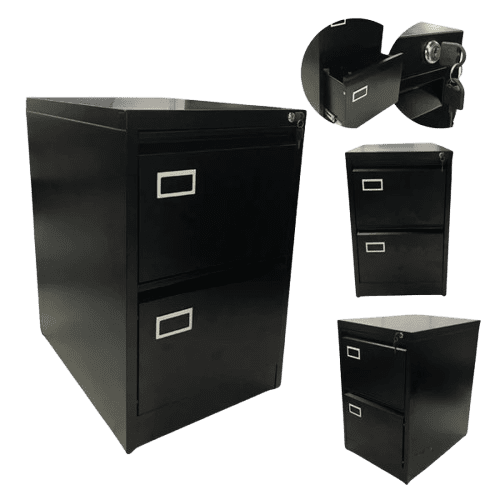 Archivador metalico de 2 gavetas incluye llave y cajones con bloqueo, color negro y gris.