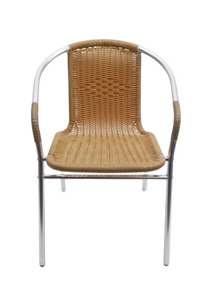 Silla de rattan apilable con estructura de tubo metálico en acabado cromado.