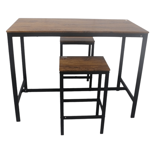 Juego de mesa alta con dos bancos, fabricado con estructura metálica negra y superficies en madera de acabado rústico.