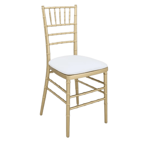 Silla Tiffany dorada de metal, incluye cojín de cuerina. Ideal para tus eventos.