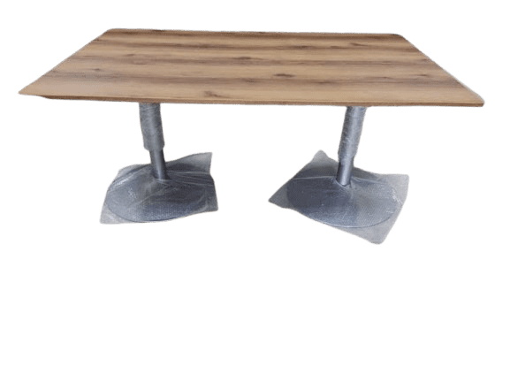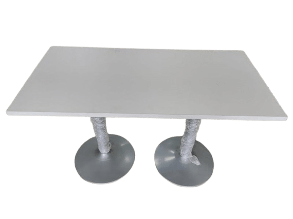 Mesa Rectangular con sobre color dolceto y cantos gruesos con base de metal fuerte color gris redonda