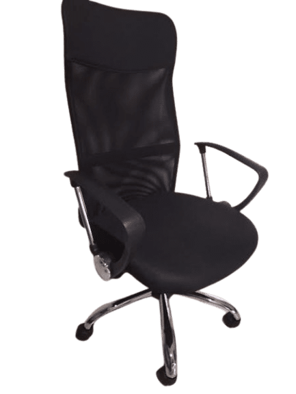 Silla ejecutiva de respaldo alto, diseñada para brindar confort y soporte lumbar. Respaldo en malla ergonómica, asiento acolchado, brazos fijos en polipropileno y estructura metálica cromada de gran durabilidad.