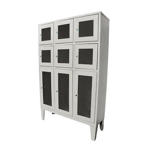 Locker de 9 puertas metálico en lámina en frío calibre 22,Cerradura con llavín en cada puerta y pata en cada esquina.