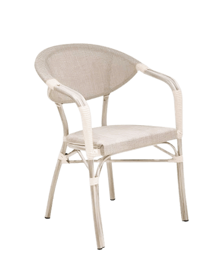 Silla de ratán sintético con brazos, cuenta con una estructura de aluminio recubierta en ratán sintético, su diseño ergonómico con respaldo curvo y apoyabrazos ofrece comodidad y estilo moderno, ideal para terrazas, jardines, restaurantes o cafeterías.