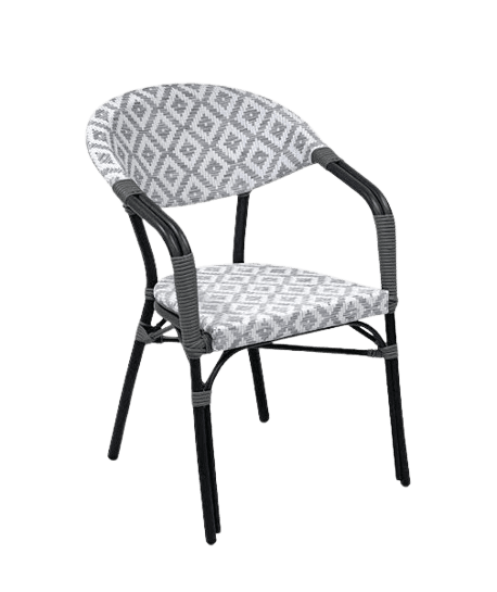 Silla de ratán sintético con brazos, cuenta con una estructura de aluminio recubierta en ratán sintético, su diseño ergonómico con respaldo curvo y apoyabrazos ofrece comodidad y estilo moderno, ideal para terrazas, jardines, restaurantes o cafeterías.