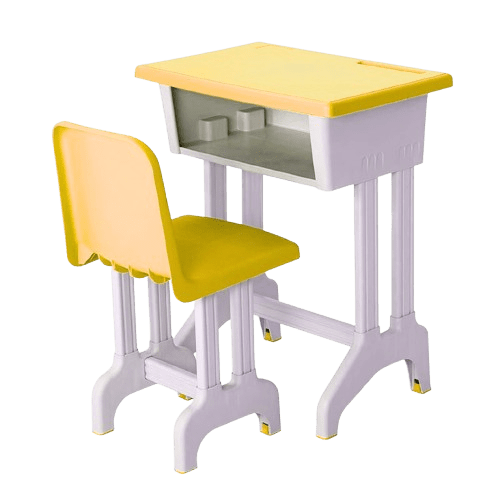 Conjunto de plástico escritorio de estudio preescolar con cajón para almacenar utensilios, libros, etc. y silla escolar.