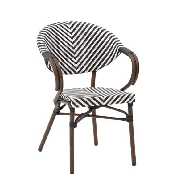 Silla de aluminio con reposa brazos con mimbre color chocolate oscuro con blanco